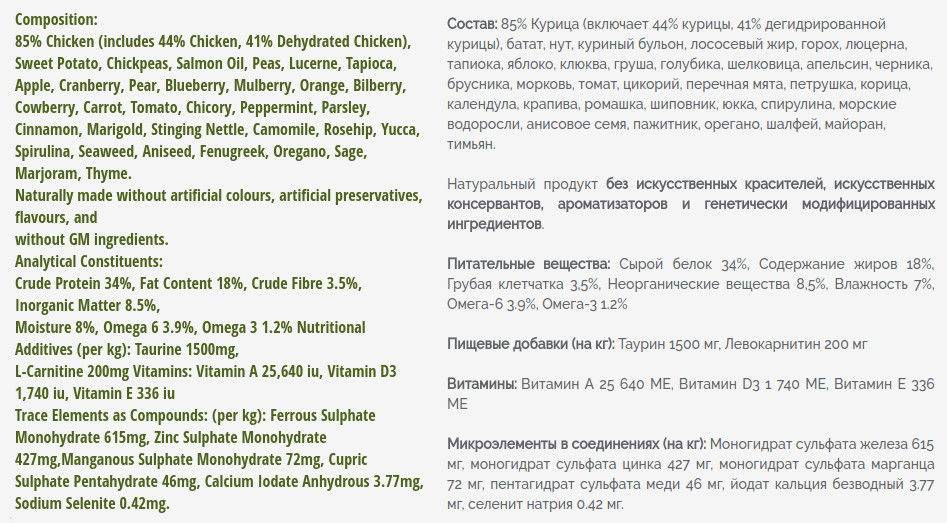Отличается богатым натуральным составом: сладкий картофель, горох, морковь, яблоко, нут, томат, люцерна, груша, тапиока, клюква, апельсин, голубика, шелковица, брусника, черника. Глюкозамин и хондроитин – для здоровья суставов. Полезные травы и пряности: перечная мята, морские водоросли, петрушка, шалфей, орегано, цикорий, шиповник, ромашка, анис, календула, крапива, корица, пажитник, Юкка Шидигера. Обогащен кальцием, магнием и фосфором.