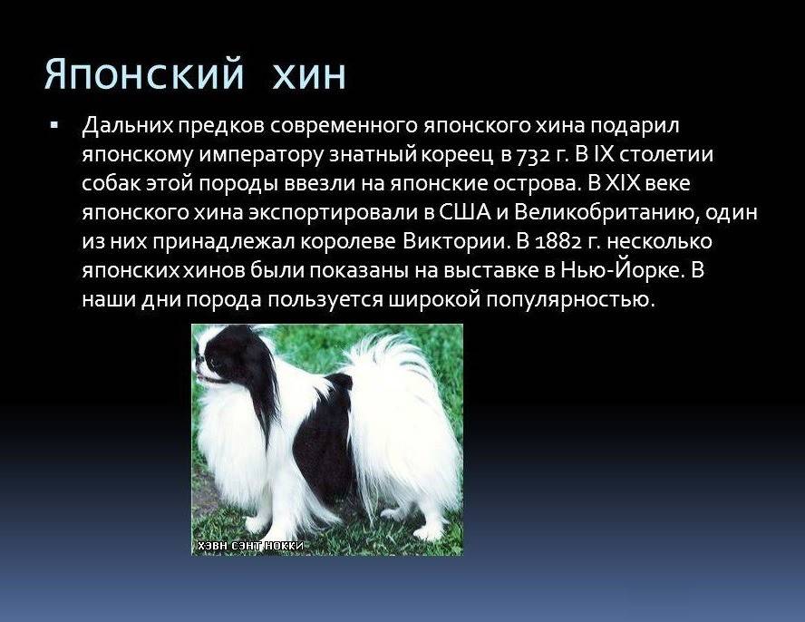 Впервые начали писать о японском хине еще в XII веке. Эта порода относилась к категории священных собак, была любимицей у аристократов. Образ японского хина наносили на фарфоровые вазы, статуэтки, деревянные изделия и даже украшали им храмы.
