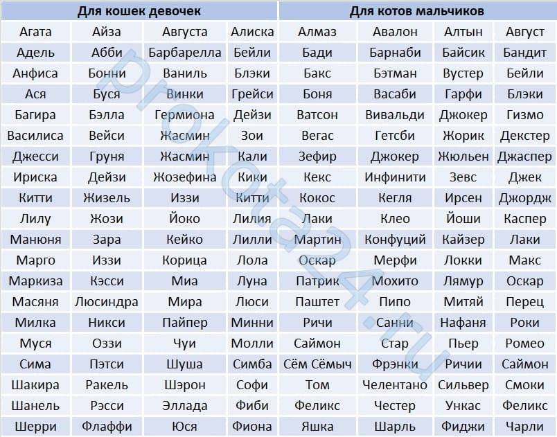 После покупки малыша владельцы озадачены выбором имени. Лучше присмотреться к котенку и найти что-то, что выделяет его, во внешности и характеру. Тогда кличка будет по-настоящему индивидуальной, присущей только ему. Но если никаких идей не возникло, не беда. Всегда можно воспользоваться таблицей популярных имен для кошек и найти кличку по душе: