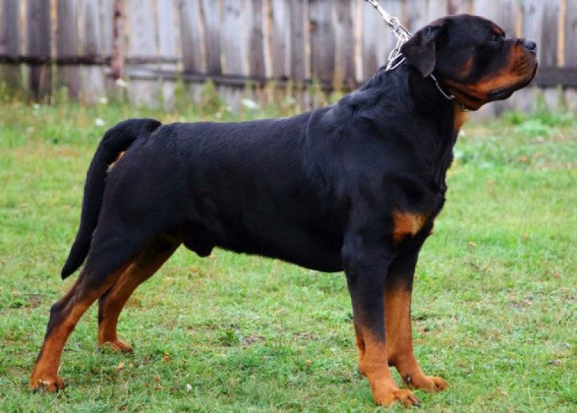 Ротвейлер. Рост до 65 сантиметров, вес до 50 килограмм. Выносливые, сильные, энергичные собаки, отличные охранники. Пёс выбирает себе на всю жизнь одного члена семьи в качестве хозяина, которому готов подчиняться. Остальных просто терпит. Нуждается в регулярном и довольно жёстком воспитании, дрессуре и ранней социализации, иначе может превратиться в злобное и агрессивное существо.