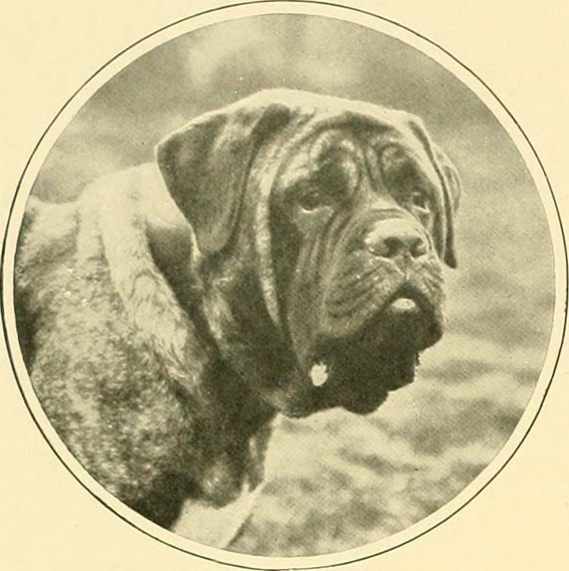 Обхват черепа кобеля в самом широком месте примерно соответствует высоте в холке. Линии морды и черепа сходятся в одной точке. На лбу есть фронтальная бороздка, от которой расходятся подвижные кожные складки. Сама морда широкая, с четким стопом, короткая и мощная. Морда в обхвате соответствует примерно ⅔ обхвата головы.