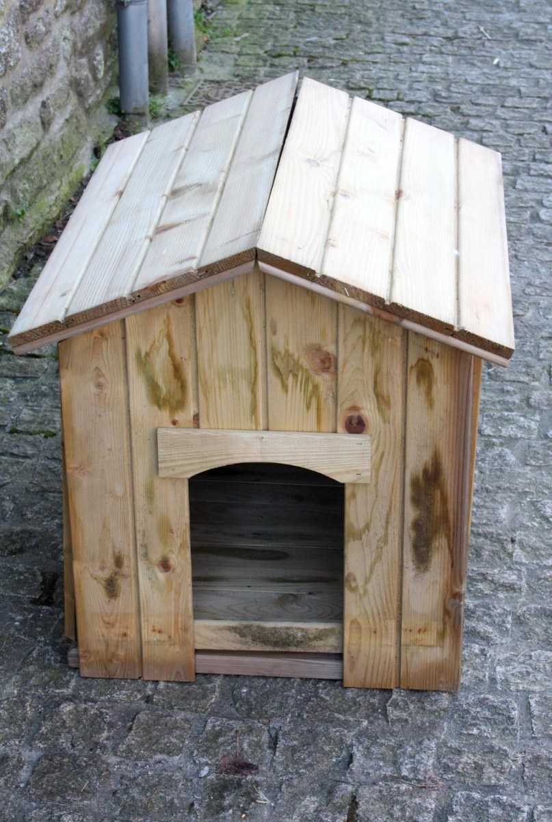 Решить подобную проблему можно, если пойти другим путем. Если сделать в будке потолок, то затем не будет никаких проблем и с двухскатной крышей. Несмотря на это, в любом случае крыша должна быть откидной на петлях, поскольку периодически придется дезинфицировать будку из-за того, что в ней предпочитают жить и размножаться блохи.