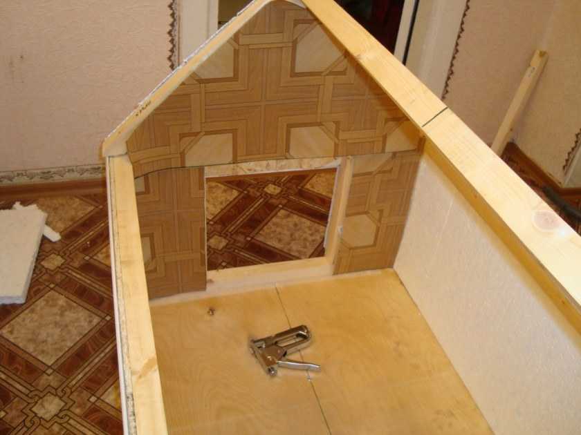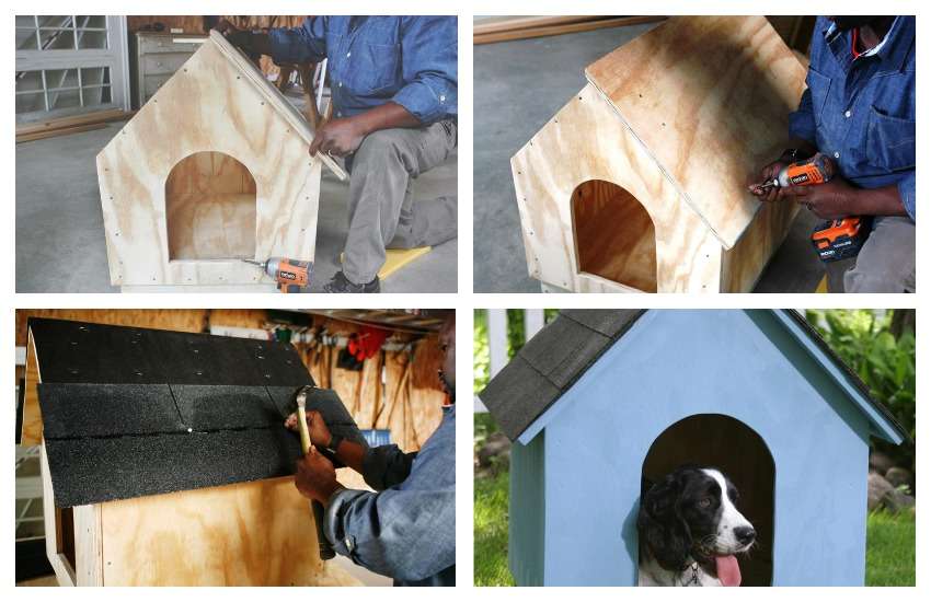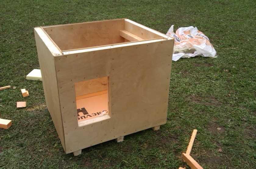 Второй шаг — обшивка домика фанерой или ОСП. Лаз для собаки желательно прорезать заранее. Края материалов отшлифовать, чтобы не было заусенцев.