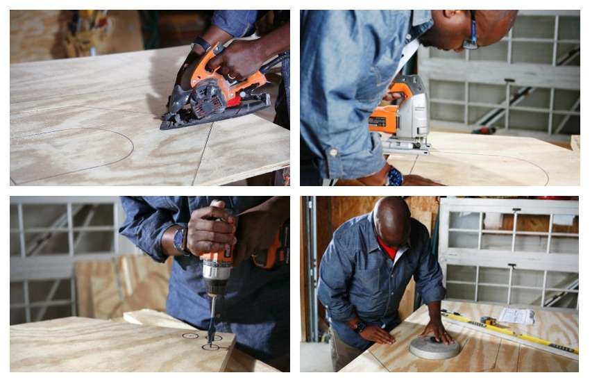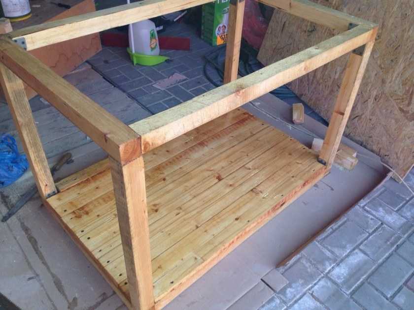 Первый этап — сборка каркаса. Нарезанные бруски соединяются саморезами. Можно сразу прибить доски пола, что придаст конструкции начальную устойчивость и облегчит дальнейшие работы.