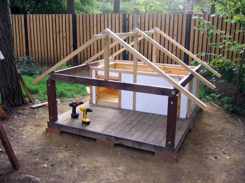 Вообще-то, собаки не так часто прячутся в будке и предпочитают проводить больше времени на открытом воздухе. Поэтому перед будкой собаки лучше соорудить что-то вроде навеса с настилом, чтобы собаке было удобно сидеть или лежать.