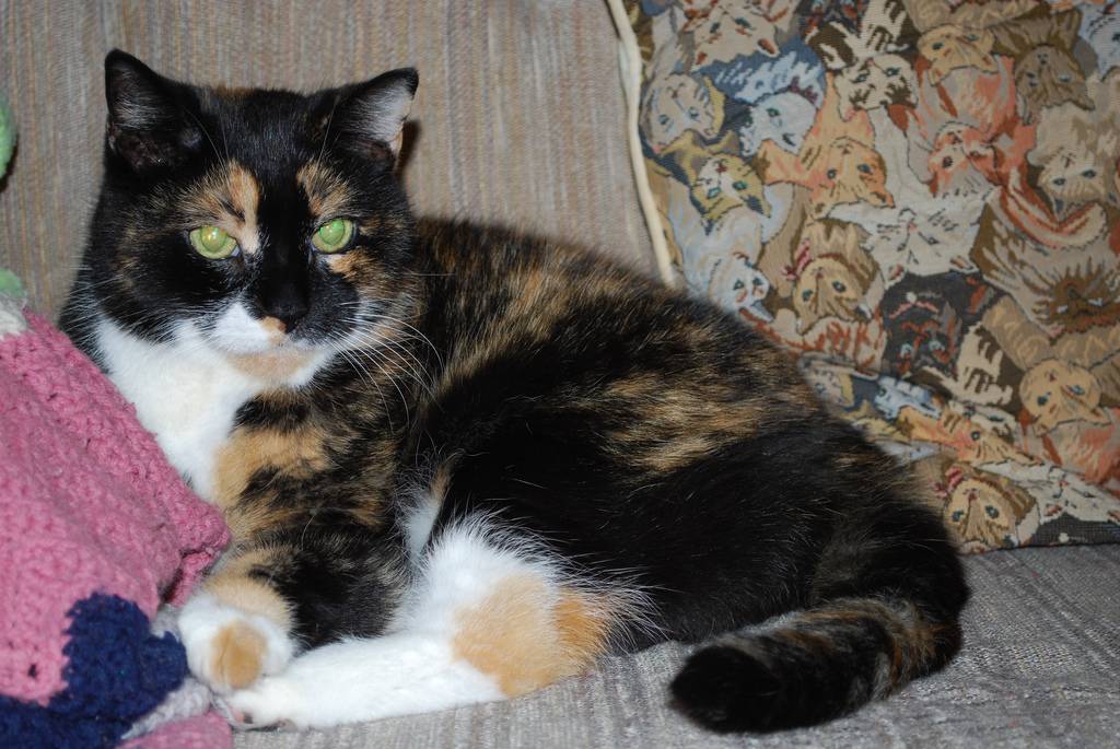 Калико – известен также как лоскутный окрас, отличается крупными областями разных цветов. Кошек с такой раскраской называют также пластинчатой или ситцевой черепашкой.