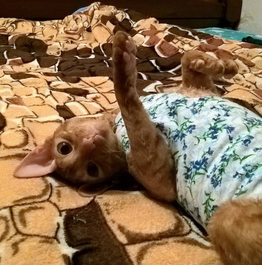 Если же кошка оказалась из характерных, и продолжает попытки стянуть с себя непривычную «одежду», то остается лишь постоянное дежурство возле нее.