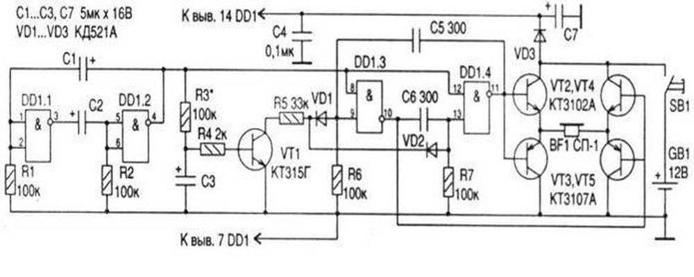 Выходные импульсы усиливаются транзисторным мостом, имеющим в качестве нагрузки пьезоизлучатель. Его можно заменить для увеличения дальности автомобильной пьезосиреной.