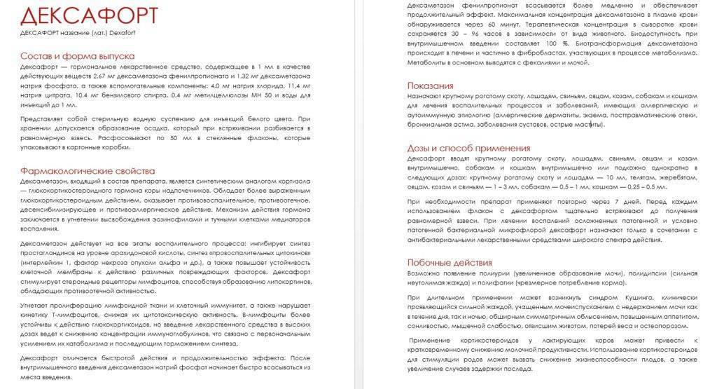 Максимальной концентрации в крови действующие компоненты Дексафорта достигают через 1 час после попадания в организм питомца. Лечебный эффект сохраняется в течение 30–96 часов и зависит от вида животного.