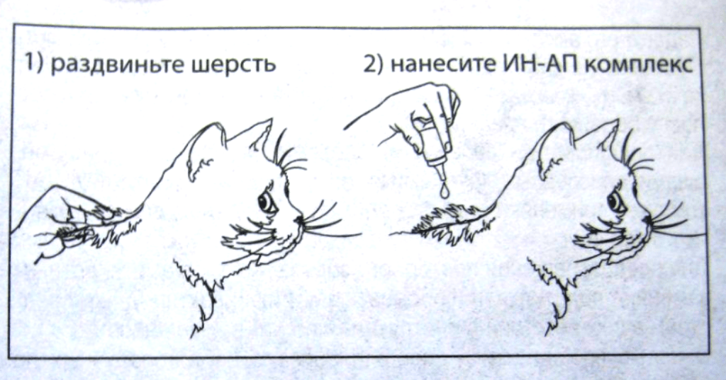 ИнструкцияПеред нанесением раствора на тело животного, нагревают его до комнатной температуры, хорошо встряхивают тюбик-пипетку и срезают кончик острым инструментом. Затем надо аккуратно раздвинуть шерстяной покров в области лопаток (можно за ушными раковинами или на шее) и капнуть жидкость на открывшийся участок. Это наиболее оптимальные места обработки, которые кот не сможет облизывать.