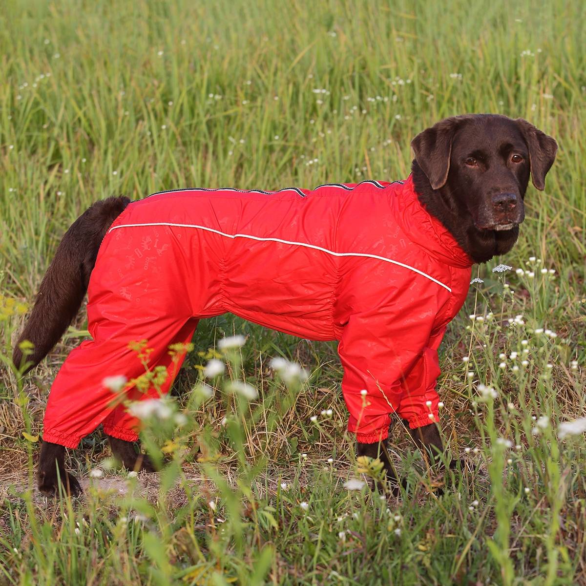 - Осенний комбинезон. Этот элемент одежды предназначен, в первую очередь, чтобы защитить питомца от грязи и дождя. Их производят из водоотталкивающих материалов, при этом не используется тёплая подкладка. Многие известные компании предлагают модели со специальной пропиткой, которая придаёт ткани влагоотталкивающие свойства. Такая одежда идеально подходит для низких и длинношерстных собачек. Нет необходимости после прогулки мыть собаку полностью, ведь её шерсть остаётся сухой и чистой. Собака не принесёт на себе ведро песка. Достаточно протереть лапы.