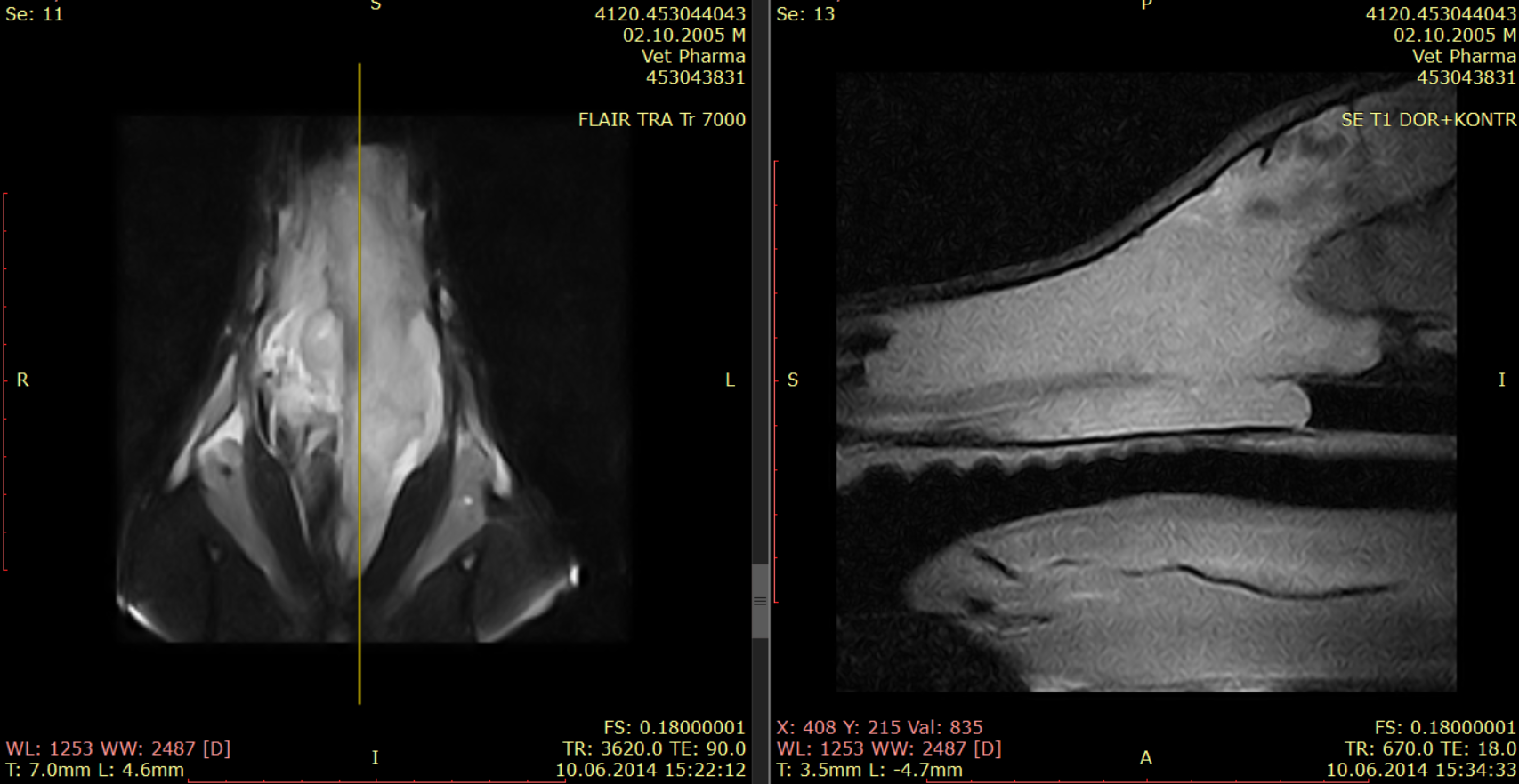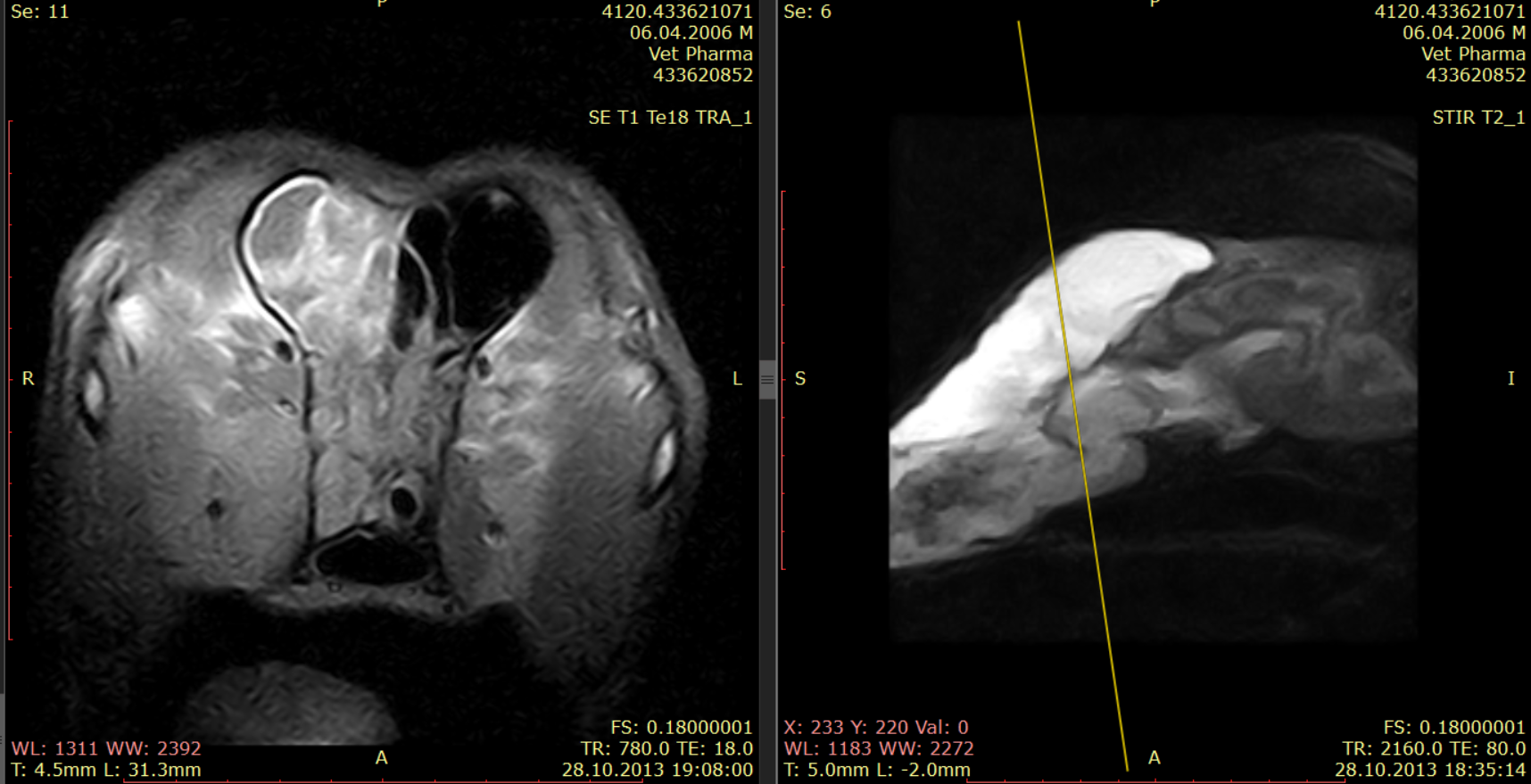 Рентгеновские снимки для визуализации носовой полости лучше делать под общим наркозом, поместив пластинку в открытую ротовую полость, чтобы получить снимок внутренних структур носовой полости.
