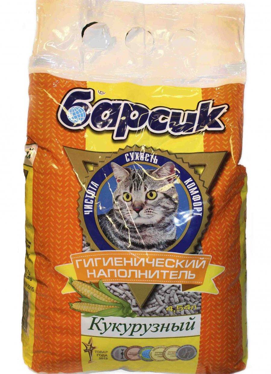 - Кукурузный. Как и древесный, является безопасным для котят и взрослых животных. Его часто используют владельцы кроликов и морских свинок. Он натуральный и неплохо удерживает запахи. Мягкий и приятный для кошачьих лап. Подходит для аллергиков, как людей, так и кошек. К недостаткам кукурузного наполнителя можно отнести то, что при закапывании он сильно разбрасывается около лотка, так как очень легкий.