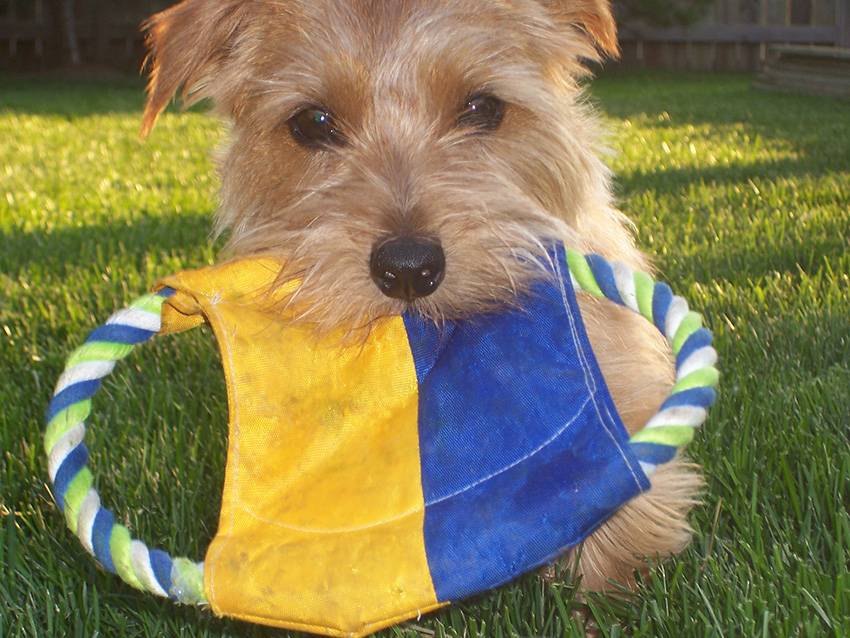 Можно поиграть с норвичем в прятки, догонялки, побросать мячик или палку.