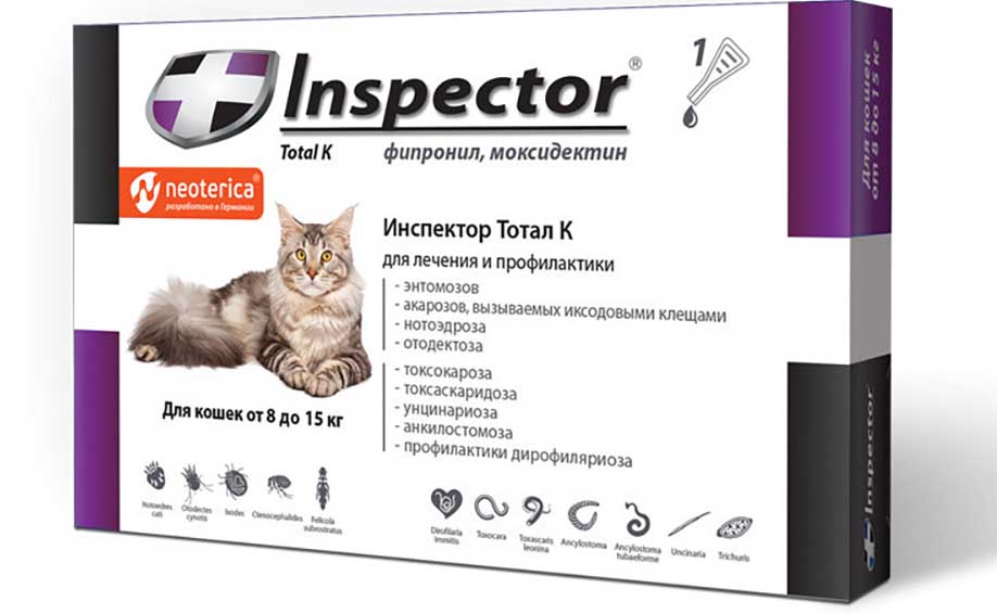 - «Inspector Total» (10% фипронила, 1% моксидектина). Эффективен против власоедов, блох, клещей и гельминтов. Цена – от 300 до 400 рублей за флакон.