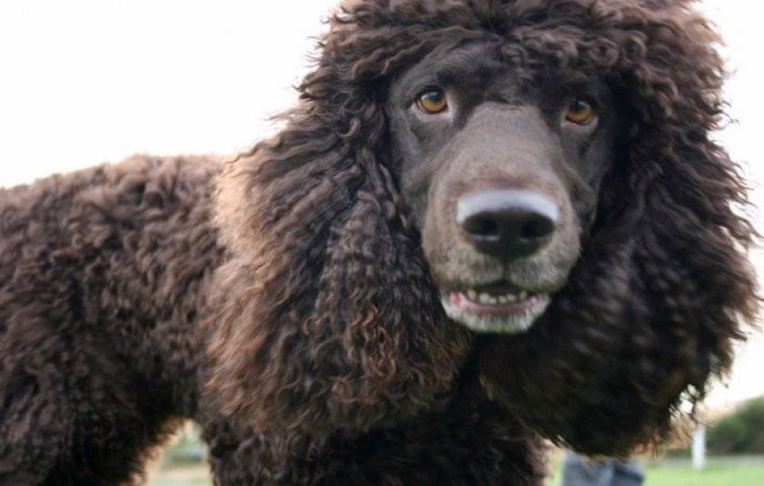 Описывая внешний вид ирландского водяного спаниеля, необходимо сказать, что это крупный по величине пес, голова которого имеет пропорциональные телу размеры, а морда — длинную форму и вытянутый широкий нос насыщенного коричнево-каштанового цвета с легким красным оттенком.