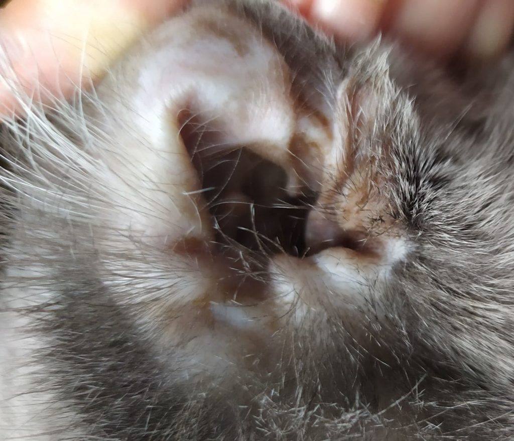 - Кожа внутри ушной раковины воспалена, покраснела, покрылась корочками.