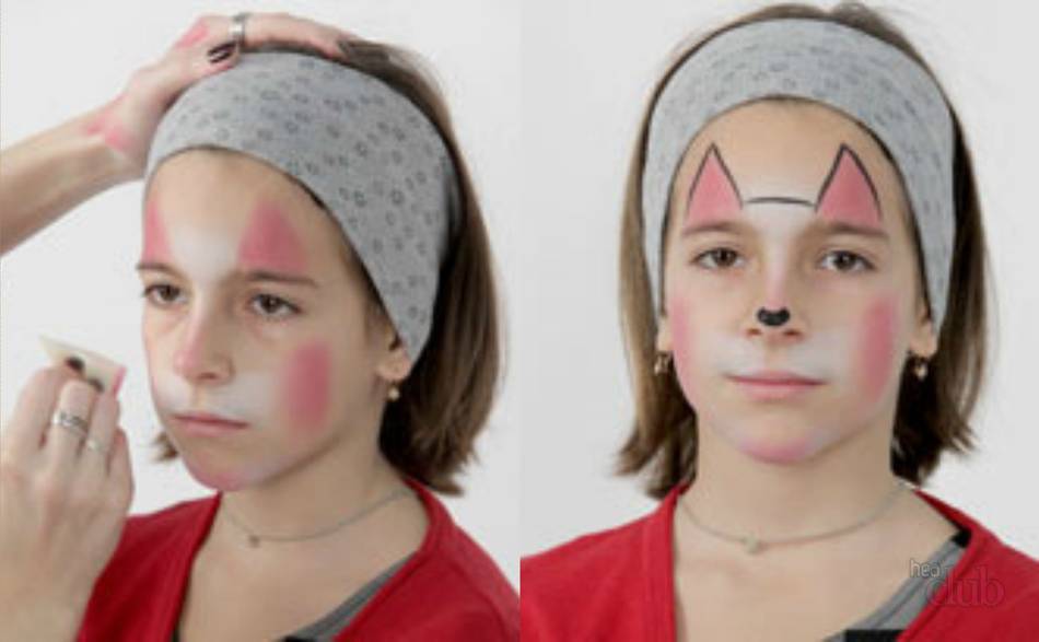 - С помощью спожа нанесите розовую краску на область над бровями. Вам следует нарисовать треугольники — они будут символизировать ушки кошечки. (см. фото № 2)