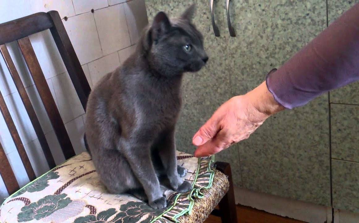 - Когда кошка дотянулась до руки, следует громко и убедительно произнести команду, а потом отдать лакомство питомцу.