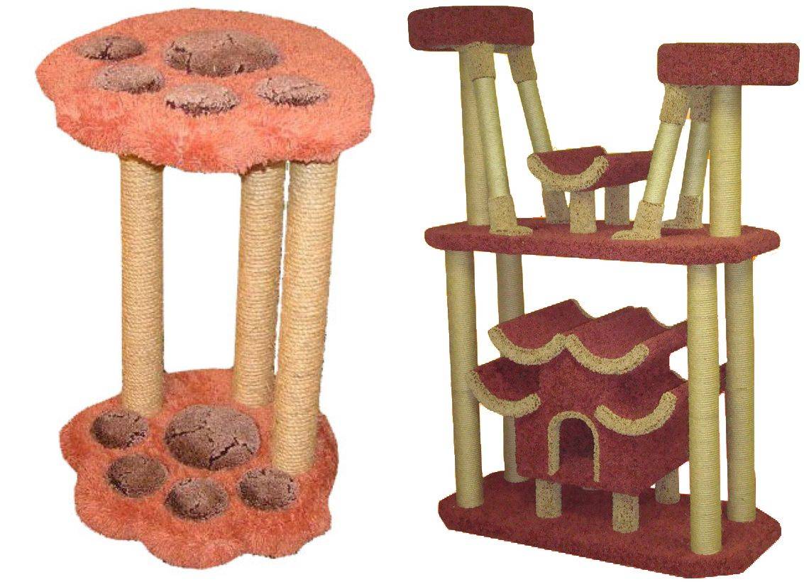 Существует множество видов когтеточек, различающихся по размерам и строению, но схожих по функции. Есть минималистичные прямоугольные полоски, обитые крепким материалом, которые прибиваются к вертикальной поверхности. Есть целые комплексы, которые мы только рассматривали, которые данный крепкий материал используют по всех поверхности.