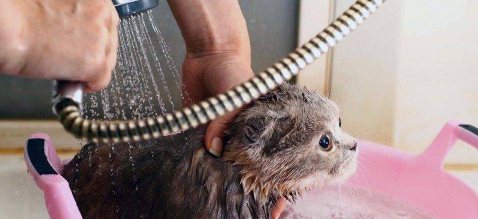 Намочить и смыть пену с кота можно при помощи ковшика или кувшина. Душ использовать крайне нежелательно, так как он шумит и пугает животное еще больше. Другой выход – включить напор на минимум.