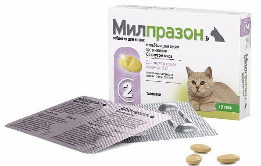 Одно из самых эффективных антигельминтных средств — Милпразон для кошек, инструкция по применению прилагается к каждой упаковке с лекарством. Выбирая Милпразон для кошек, весящих больше 2 кг, нужно чётко рассчитывать дозировку. Кошечка весом 2–4 кг должна получить половину таблетки. Питомцам весом 4–8 кг дают 1 таблетку. Для больших котов массой 8–12 кг нужно 1,5 таблетки.
