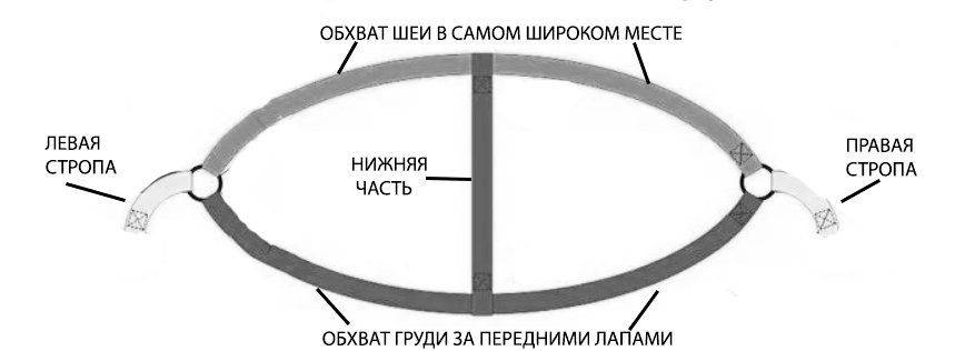 После этого отмеряем необходимое количество строп по чертежу, оответсвенно размерам вашей собаки.