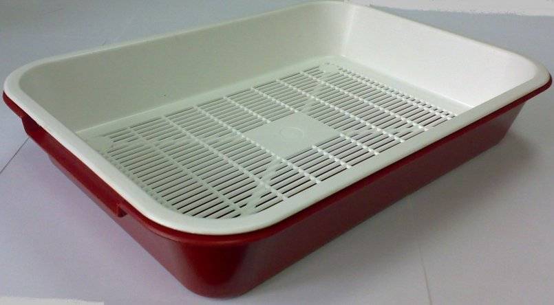Покупать лучше сразу большой пластиковый лоток, ведь питомец будет расти быстро. Опытные кошководы советуют останавливать свой выбор при покупке на ёмкости без решетки. Так котёнок не будет цепляться за неё лапками при закапывании наполнителя.
