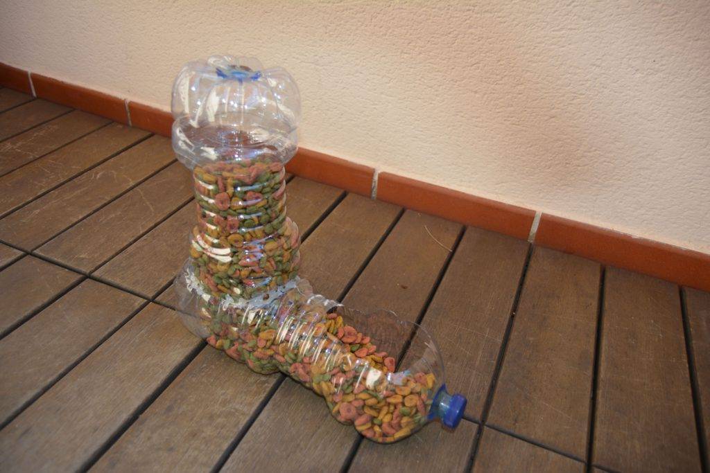 Засыпать корм. Кошка будет старательно катать бутылку по полу, добывая провиант