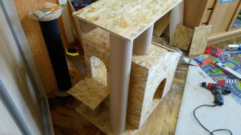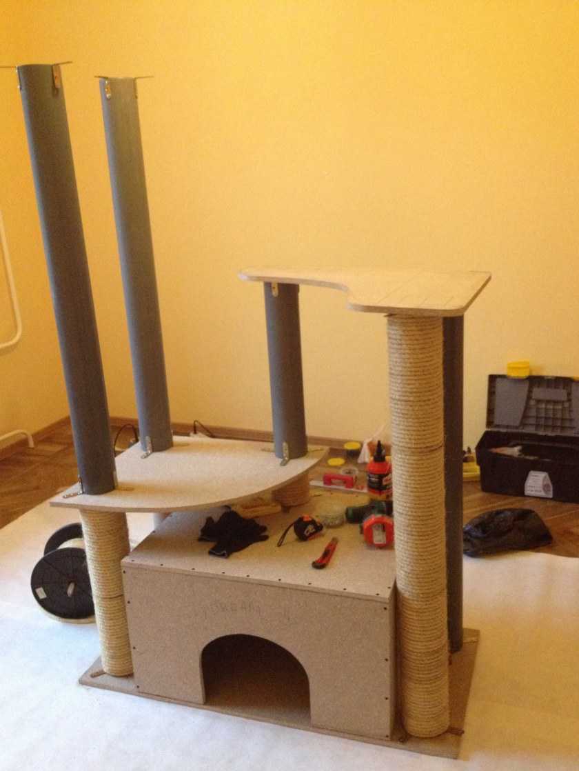 Когда проектирование хижины закончено, а все материалы находятся под рукой, можно приступать к работе. Базовый каркас может быть одно-, двух- и даже трехъярусным. Количество платформ также зависит от числа кошек в доме. Так, если в квартире проживают два питомца, то для каждого из них должна быть свое сидение.