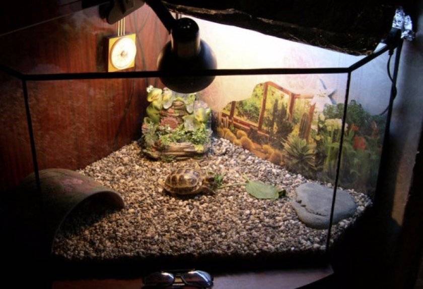 Сухопутные черепахи содержатся в террариумах. Размер террариума высчитывается в зависимости от размеров самой черепашки. Так, для 10-сантиметровой рептилии понадобится террариум примерно на 60 литров.