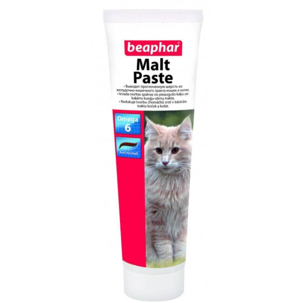- Мальт-паста. Считается одним из самых эффективных средств в борьбе с проглоченной шерстью. Состоит исключительно из натуральных безвредных компонентов, имеет приятный вкус: большинство котиков едят её с удовольствием.