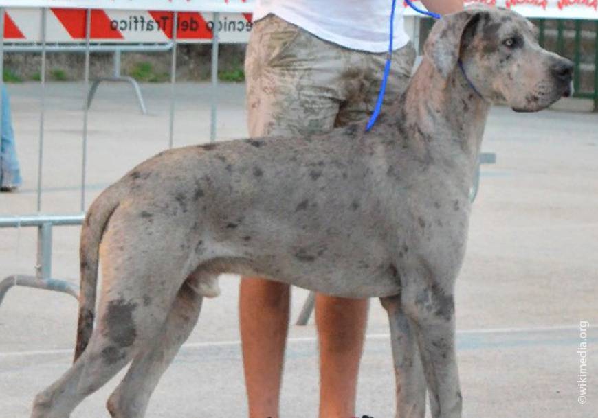 - шерсть короткая имеет белый окрас, но допустимы тигровые и пятнистые псы.