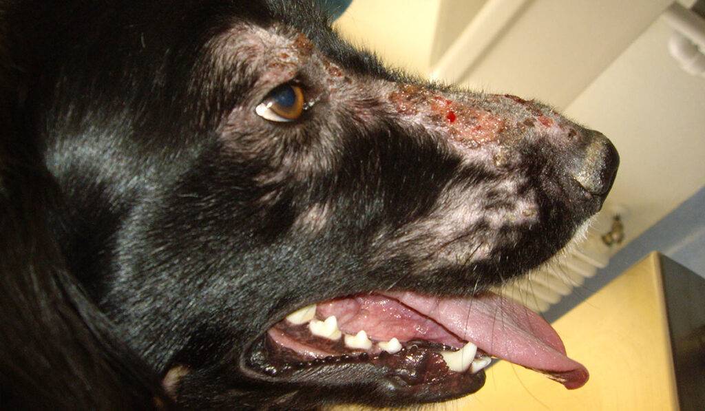 Является самой простым видом течения рассматриваемого недуга. Чаще всего кожный тип чумы проявляется первоначально, за ним уже следует легочная или кишечная вариация. Кожная форма чумки характеризуется папиллезно-пустулезной сыпью, выступающей на туловище особи. Высыпания локализуются на внутренней части бедер, на брюшке, в ушах, около глаз и пасти. Впоследствии появившиеся пузырьки лопаются, образуя коричневые корочки. Также при кожном течении болезни Карре можно заметить распухание лап, ушей, век, губ.