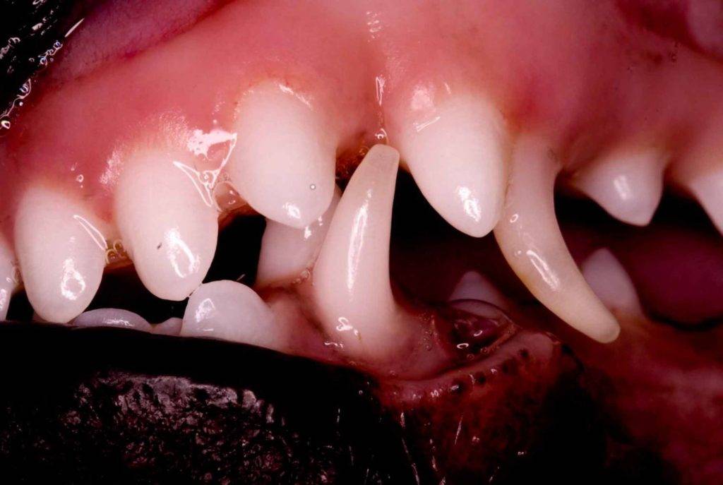 У некоторых собак возможны проблемы со обновлением состава ротовой полости, обусловленные анатомическими особенностями строения челюсти. Это касается среднемордых и длинномордых питомцев. Постоянные зубы растут по принципу минимального сопротивления, то есть по каналу, оставшемуся после молочного образования, поэтому если последний не выпадает по каким-либо причинам, постоянный может вырасти в неправильном месте либо не вырасти вообще. Это будет серьезным препятствием для животного при необходимости участия в выставках или племенном разведении.