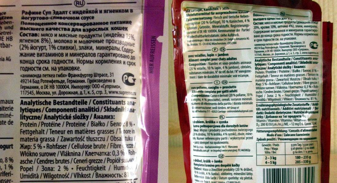Важным преимуществом корма, производимого компанией «Animonda Petfood GmbH», является то, что на каждой упаковке покупатель может найти достоверную информацию о его составе. Если корм содержит некоторое количество субпродуктов, об этом написано открыто, не таясь.