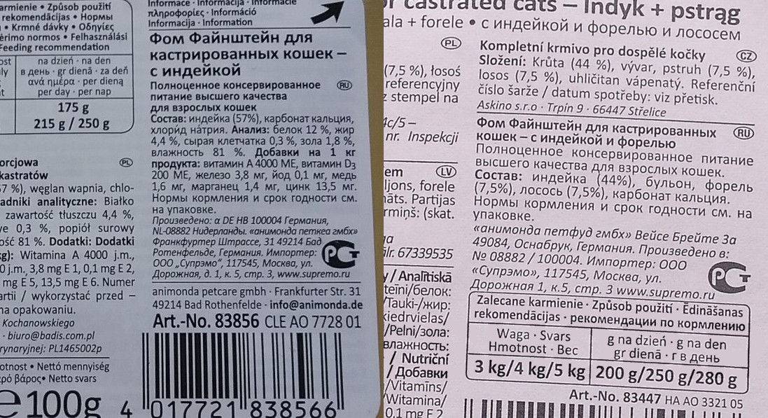 Слева — фото состава Vom Feinsten Kastrierte Katzen Pute pur. Справа — состав Vom Feinsten Vom Feinsten Kastrierte Katzen Pute + Forelle.