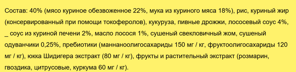Состав корма на русском языке взяли у продавца. Мясные продукты (курятина) занимают 40% объема. Обезвоженный соус из продуктов переработки лосося и куриной печени – 6%. Это источник легкоусвояемых аминокислот и корректор вкуса.