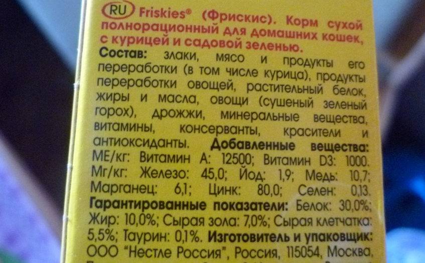 Рассмотрим состав сухого корма «Фрискис» для взрослых кошек с мясом и полезными овощами. В перечне компонентов присутствуют следующие позиции:
