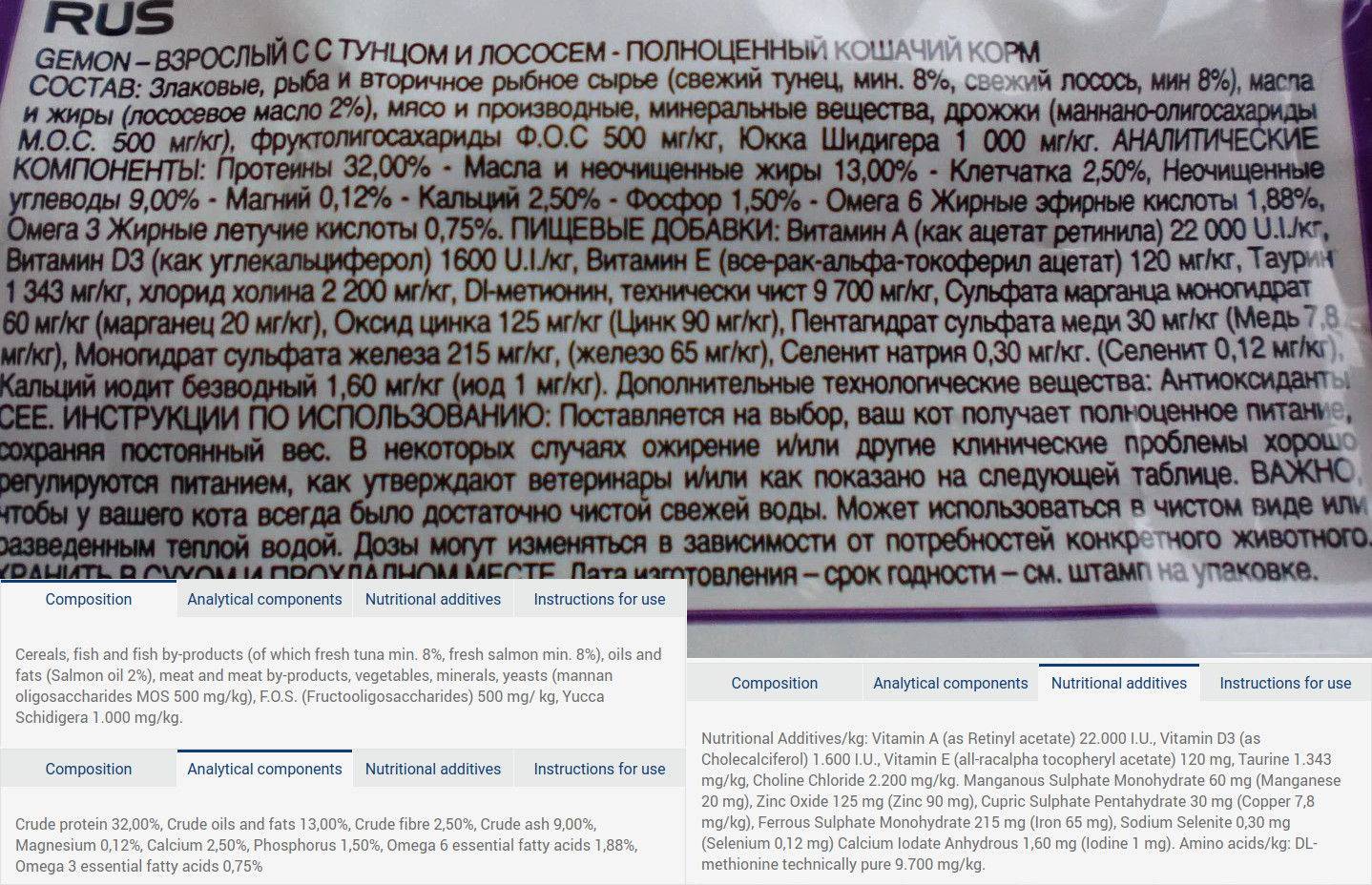 Ознакомимся с составом корма Gemon на примере варианта «Adult Complete with Tuna and Salmon» (для взрослых кошек с тунцом и лососем). Посмотреть его можно на изображении ниже (для удобности чтения кликните по нему чтобы увеличить):