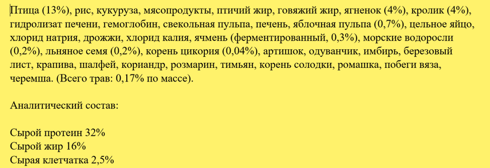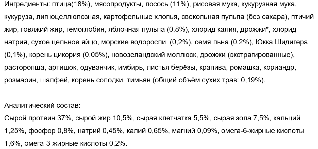 К монобелковым рационам из-за разных видов птицы в составе его отнести сложно. Из злаков в корм добавлены только вариации риса – по крайней мере, здесь нет кукурузы и пшеницы, что уже радует. А вот картофельные хлопья в сочетании с рисом в первой пятёрке говорят о том, что углеводов в этом корме многовато.