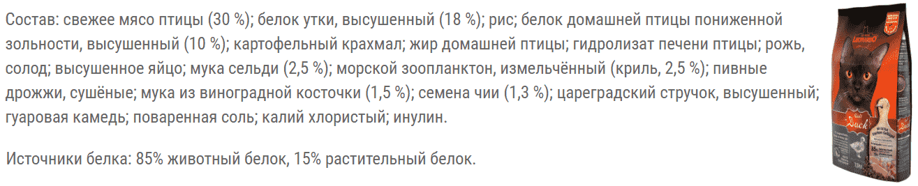 Действительно в составе кормов для кошек Leonardo мы нашли муку из мяса сельди и цыпленка и совсем не обнаружили субпродуктов. Примечательно, что доля животного белках в данных кормах – от 85%!