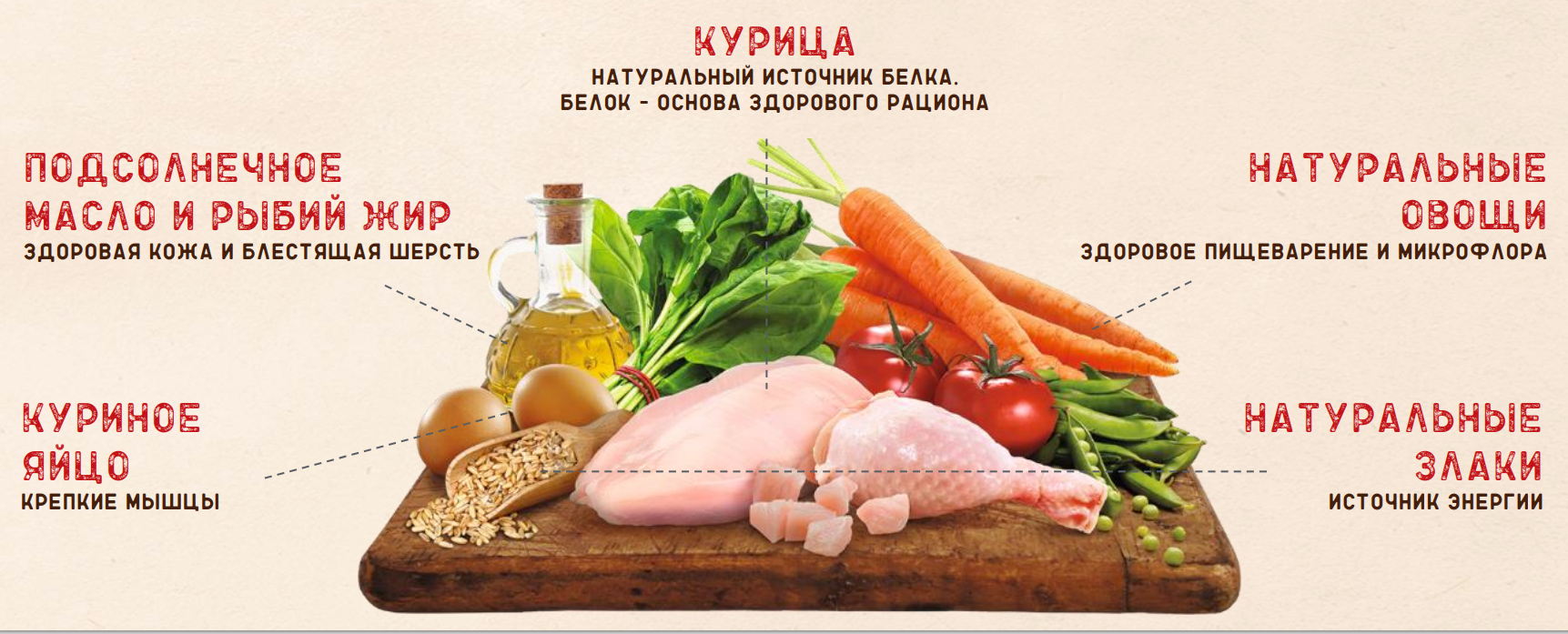 И, конечно же, курица, как источник натурального белка — одного из важнейших питательных веществ в рационе. Поэтому в кормах Nature’s table такой высокий уровень содержания белка: 41% в сухом корме для кошек, 27% в сухом корме для собак и 9% во влажном корме для кошек.