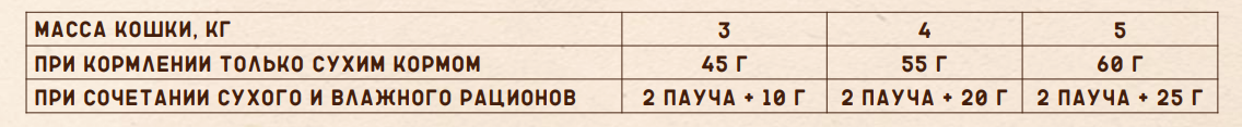 В таблице ниже представлена информация о том, как можно грамотно сочетать эти два вида рационов при кормлении кошек. Например, для мурлыкающего питомца весом 4 кг рекомендуется давать за день 2 пакетика влажного корма (так называемые паучи) и 20 грамм сухого.