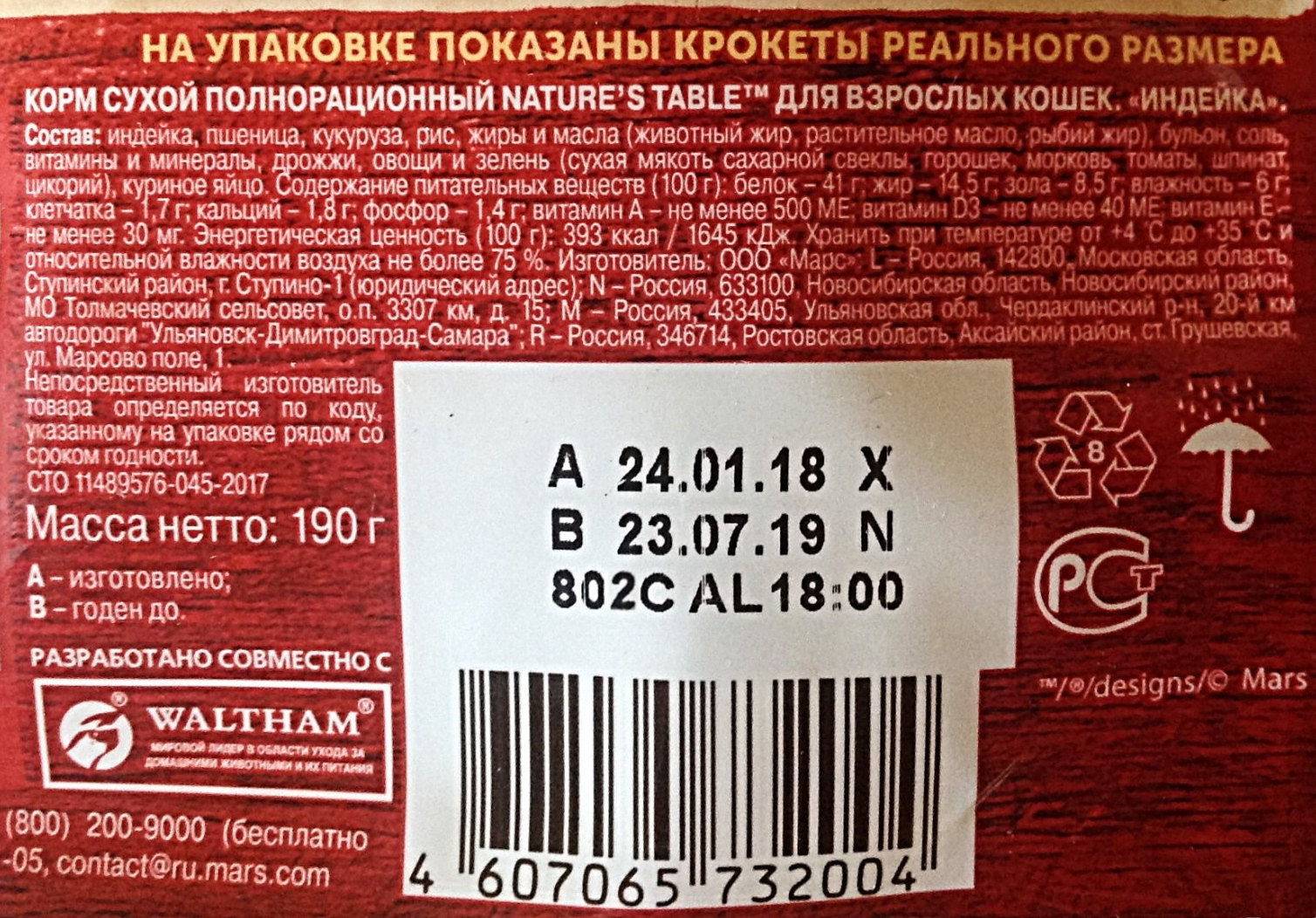Рассмотрим состав корма Nature’s Table на примере варианта «Индейка, для взрослых кошек»: