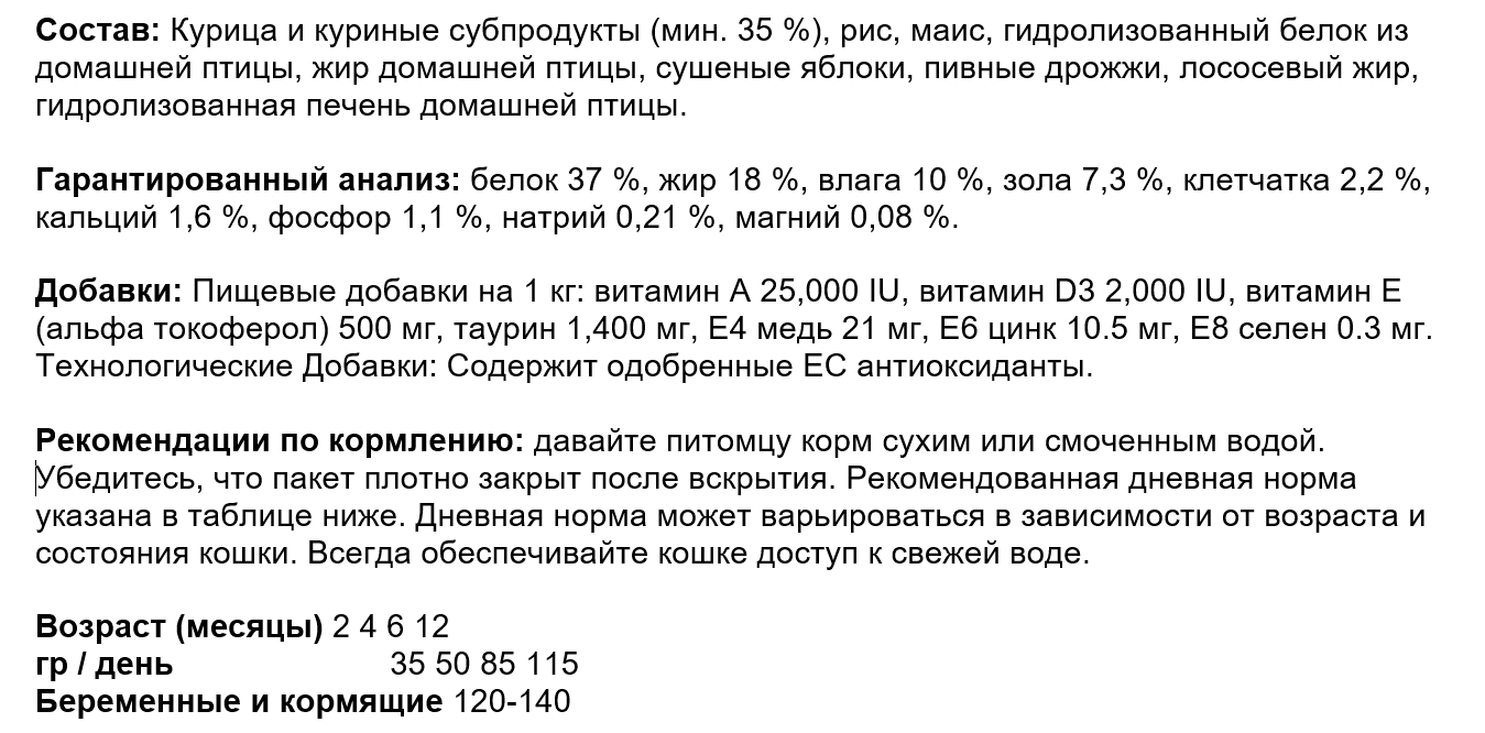 Этот корм является полнорационным, изготовлен из ингредиентов высокого качества. Процент куриного мяса и субпродуктов в нем составляет 32%. Белков в упаковке содержится 32%, жиров – 14%, углеводов – 10%.