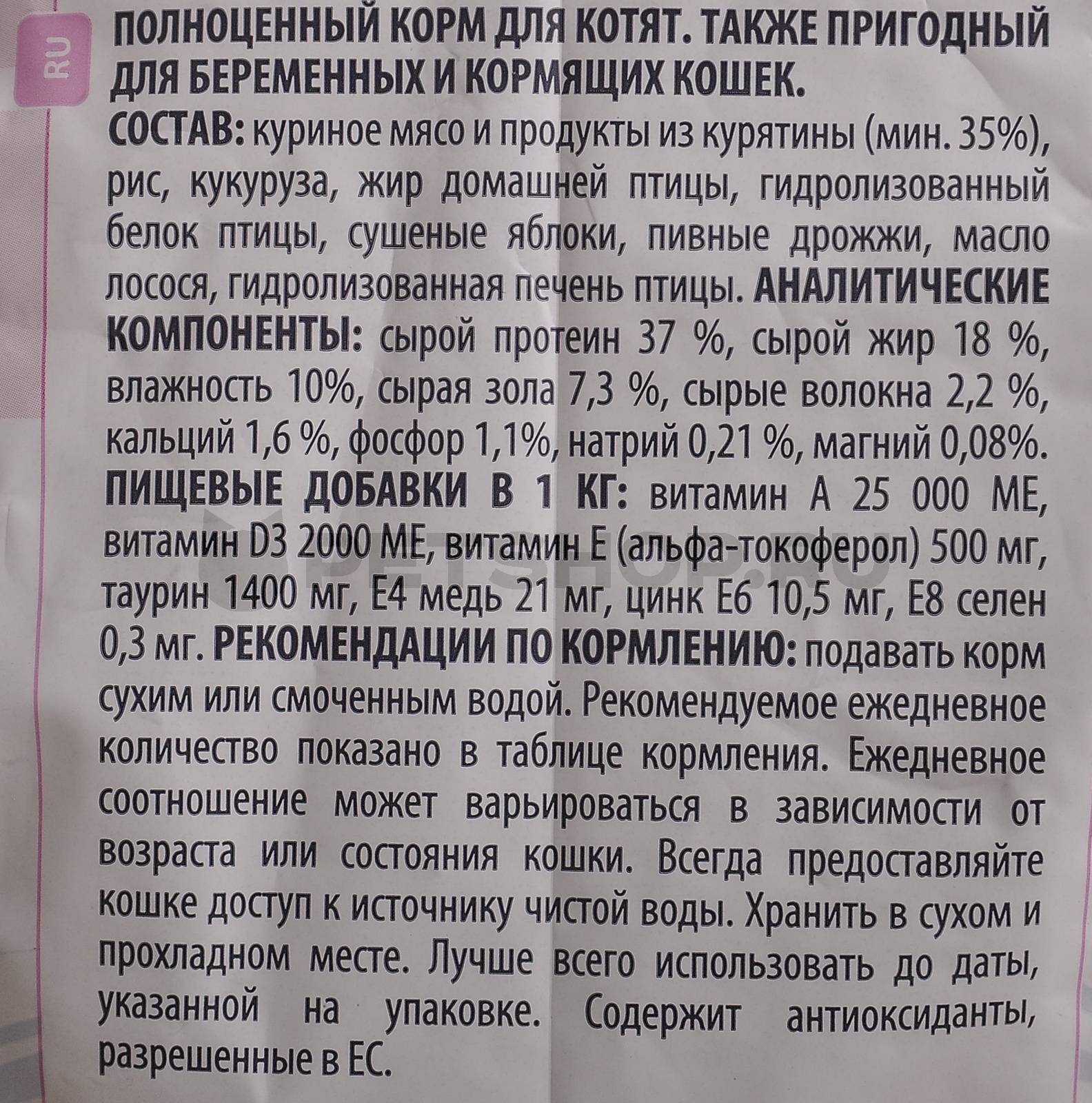 Для котят и кошек, находящихся в положении и кормящих, особенно важно сбалансированное питание, потому что растущие организмы должны развиваться правильно, а кошки должны произвести на свет здоровых котят. Этот корм изготовлен по специальной технологии, позволяющей сохранить полезные вещества по максимуму