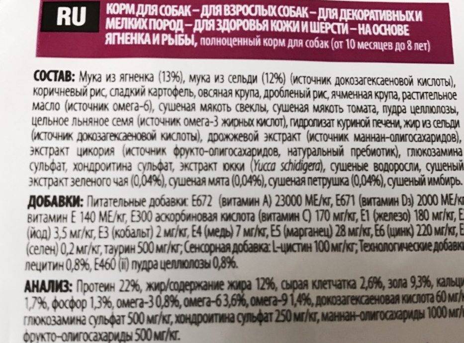 Корм предназначен для собачек возрастом 10 месяцев – 8 лет. Основа животных протеинов – гипоаллергенные компоненты – рыба и ягненок. Сочетание цистеина и незаменимых жирных кислот омега-3, омега-6 благоприятно сказывается на здоровье кожи и красоте шерсти. Комплекс растительных компонентов устраняет неприятные запахи из пасти.