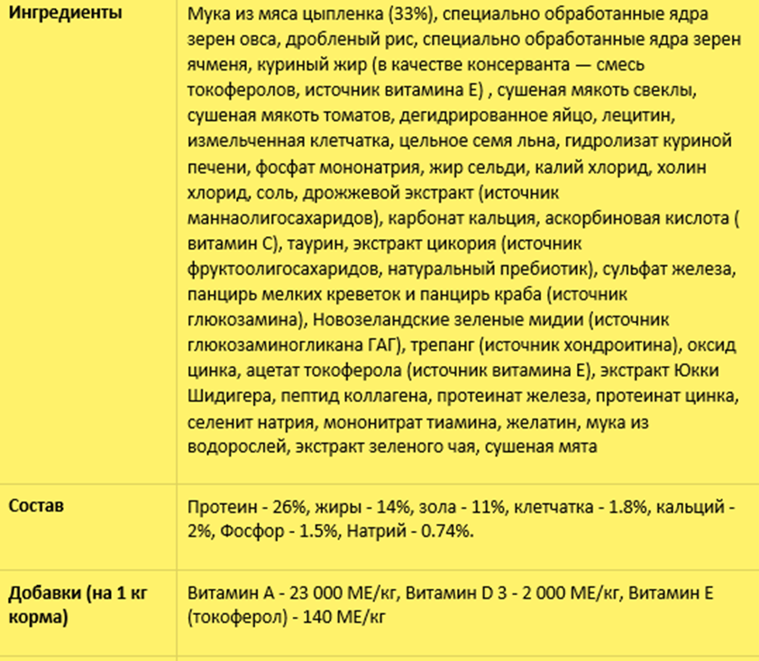 Для поддержания здоровья сеньора в кормосмесь включили следующие компоненты: