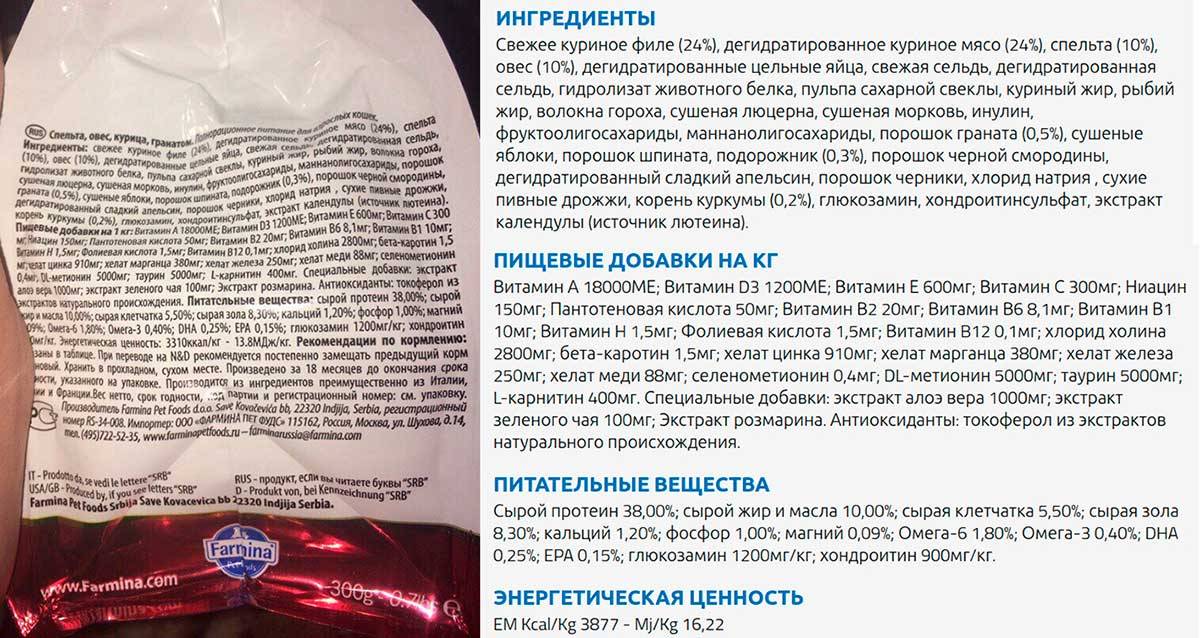 Как обычно бывает, первые 5-6 компонентов говорят нам, из чего же, в общем, состоит корм. Тут мы видим весьма достойные компоненты.